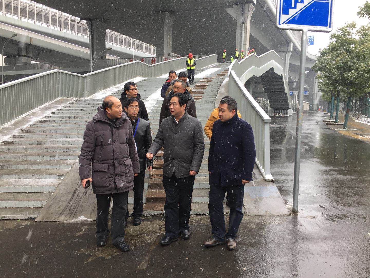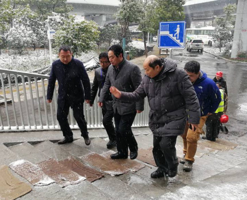 1月26日下午,城投集團公司董事長金國發冒著大雪來到雄楚大街項目現場,實地檢查雄楚大街沿線天橋在低溫雨雪天氣條件下的安全情況。金董事長詳細詢問了雨雪冰凍天氣天橋的防凍防滑等安全措施,并要求參建單位要切實加強人行天橋的安全實時檢查,措施保障到位,確保行人通行安全。 城投集團項目部相關負責同志、橋建集團董事長朱明剛參加了檢查活動。