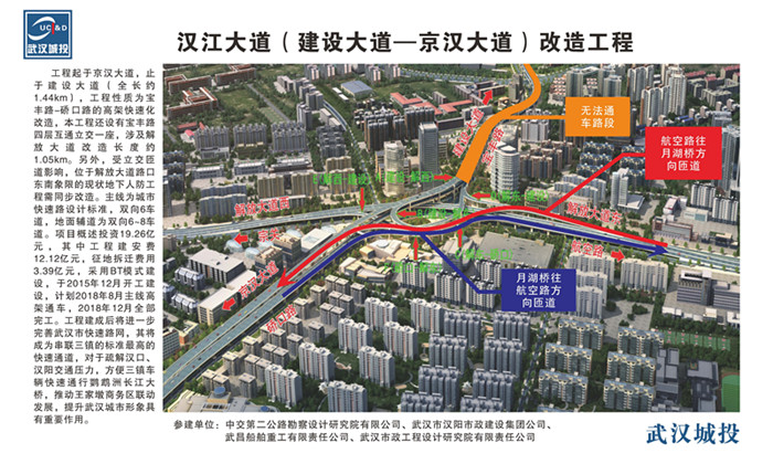 整個(gè)漢江大道工程是常青路-硚口路-江漢四橋快速通道,為武漢主城區(qū)快速路的重要組成部分,南接南三環(huán),北至北三環(huán)并與機(jī)場高速連接。