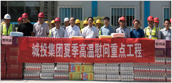 金董事長在項目現(xiàn)場和工作人員親切交談,在了解到現(xiàn)場防暑降溫物資齊備、作息時間安排合理等情況后,他指出,近期武漢持續(xù)高溫晴熱,大家在一線工作十分辛苦,他代表市城投集團公司向大家表示慰問和感謝。金董事長要求,各參建單位要進一步做好防暑降溫工作,給予高溫露天作業(yè)人員更多的關(guān)心,確保大家的身心健康。
