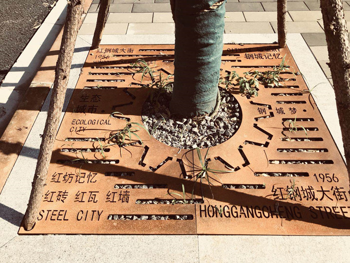 經過整治提升后的,紅鋼城大街全線拓寬為雙向六車道。人行道上采用磚紅色的耐候鋼包邊站石,行道樹的樹穴采用刻有“紅坊記憶”“紅磚、紅瓦、紅墻”等字樣的耐候鋼板篦子,就連垃圾桶、車擋等都是采用“工業風”軸承外形,從制作、材質上都彰顯出“鋼城文化特色”。人行道上的坐凳采用芝麻黑花崗巖雕刻,石材表面刻有齒輪、軸承、扳手、錘子等工業圖案,坐凳面層采用芬蘭防腐木。人行道上鋪設了透水磚,能“吃”進雨水。道路兩側綠化帶和人行道行道樹選用了無患子、巨紫荊、烏桕等樹種。秋天來臨時,這些樹木的葉子將變成紅色,烘托紅鋼城獨特的文化氣息,成為名副其實的一條生態景觀廊道。