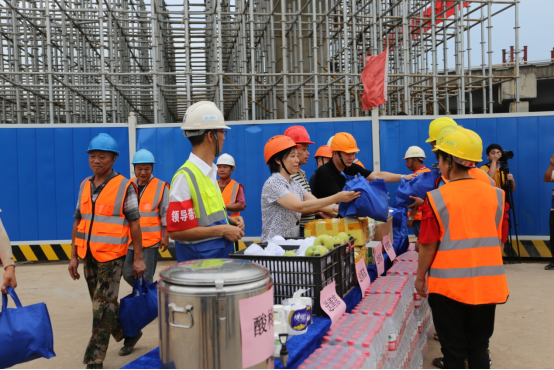 下午16時,市城建局副局長向暉帶領工會、辦公室、安監站負責人等黨員干部來項目現場,走訪慰問了奮戰在生產一線的廣大建設者,詳細詢問他們施工作業和生活情況,送去礦泉水、防暑保健品等防暑降溫物資,并叮囑各參建單位要合理調整施工時間,注意安全生產、施工質量和防暑降溫工作,保障廣大工友們的人身安全。