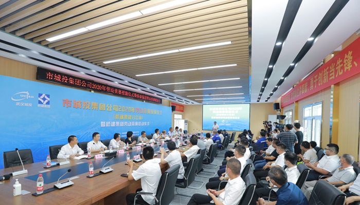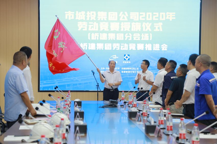 2020年8月12日下午,城投集團公司2020年勞動競賽授旗儀式(橋建集團分會場)暨橋建集團2020年勞動競賽推進會在橋建集團代建的“兩湖隧道”東湖段現場項目部舉行。城投集團副總經理盛華同志出席活動并為橋建集團授旗。