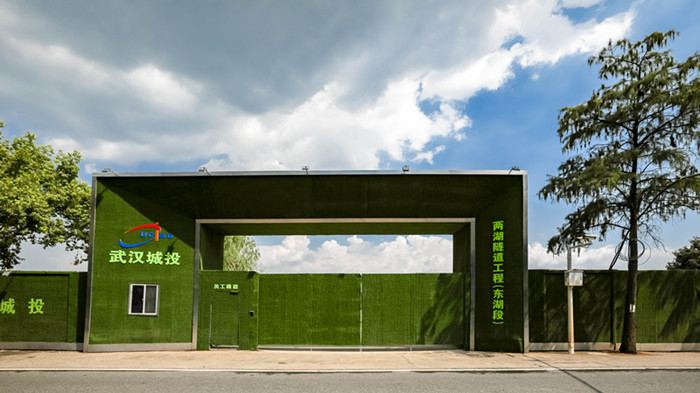 在兩湖隧道東湖段項目現場,一塊塊高達3米的生態草坪圍擋,將整個施工現場嚴絲合縫地圍攏起來,點綴在圍擋上的各種花花草草,不僅扮靚了周邊道路,也讓整個圍擋充滿生機與活力?!傲臑楹巷嫞豢v醉后談”,在這些生態圍擋上,一幅幅簡明山水詩畫穿插其中,融情于景,與大美東湖渾然一體。