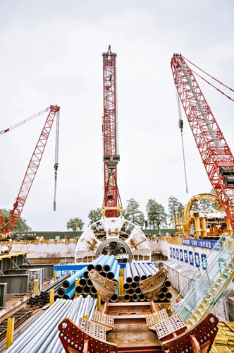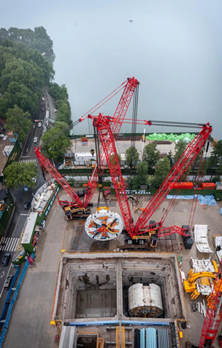 年內,兩湖隧道建設所需的“東湖號”“功勛號”“爭先號”3臺盾構機將陸續完成組裝和始發。其中,“東湖號”盾構機是兩湖隧道工程首個下井的盾構機,待刀盤定位安裝后,“東湖號”盾構機將開展管線聯接、調試等后續工作,計劃于6月底正式始發,一路向北掘進,穿越東湖,直達省博工作井。另外,位于省博工作井的“功勛號”盾構機,也在進行著緊張忙碌的組裝,并計劃于近日實施刀盤吊裝。
