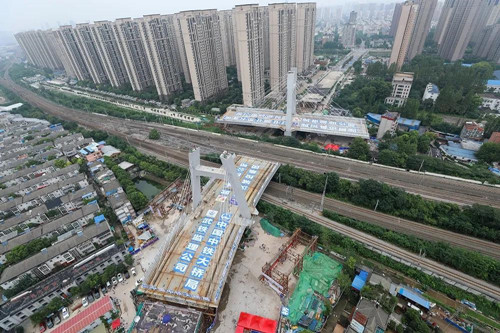 為將工程建設(shè)對(duì)既有線路的影響降到最低,建安街跨鐵路橋轉(zhuǎn)體施工技術(shù)——將橋梁結(jié)構(gòu)在非設(shè)計(jì)軸線位置制作形成后,通過轉(zhuǎn)動(dòng)體系使其旋轉(zhuǎn)就位。由于京廣線非常繁忙,轉(zhuǎn)體橋必須在鐵路運(yùn)行“空檔期”進(jìn)行,因此分兩次實(shí)施轉(zhuǎn)體,且每次轉(zhuǎn)體都須在2個(gè)小時(shí)內(nèi)完成,轉(zhuǎn)體角度較大、鄰近既有線施工、周邊住宅樓密集等因素更是增加了作業(yè)難度。8月18日,在項(xiàng)目建設(shè)各方的共同努力下,重達(dá)1.4萬噸的7號(hào)墩梁逆時(shí)針旋轉(zhuǎn)83度后,與前一天已旋轉(zhuǎn)到位的6號(hào)墩梁體在京廣線上方成功“牽手”。