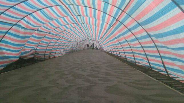 4月份,項目部進行了相當一部分瀝青鋪設和大量的Fr5.0鋼筋混凝土澆筑,現(xiàn)場生產(chǎn)如火如荼。但是,武漢在這一時間段內(nèi)也進入雨季,連日的大雨給施工帶來了非常不利的影響,給瀝青攤鋪和混凝土澆筑造成了嚴重的阻礙。在這種天氣下,項目部決策果斷,下令制造雨棚,保證混凝土及時養(yǎng)護,也給現(xiàn)場作業(yè)提供了寶貴的時間也給項目按期完工提供了有力保障。