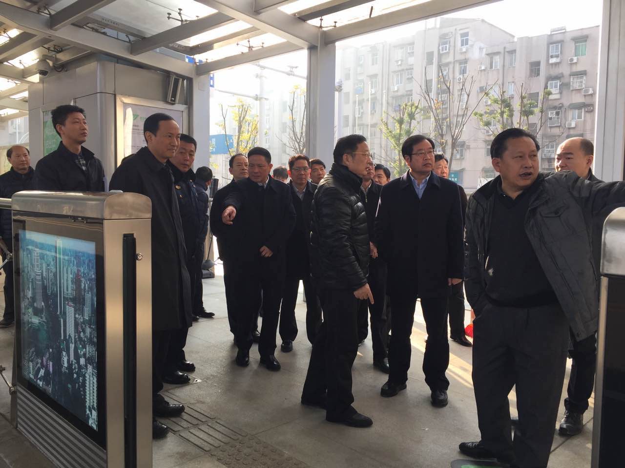 市領(lǐng)導(dǎo)一行乘坐試運(yùn)行公交車沿雄楚大街BRT檢查各個(gè)公交站臺(tái)的建設(shè)和調(diào)試情況,并對(duì)BRT開通后的交通組織方案和人行過街措施提出了具體要求。
