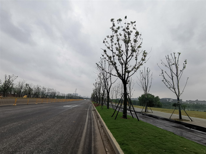 在黃家湖大道施工過程中,除了注重美化造景之外,在施工工藝上也有一些新的突破,首次將房建改良地基的管樁技術用于市政工程,并將海綿城市的相關技術用于道路施工中。